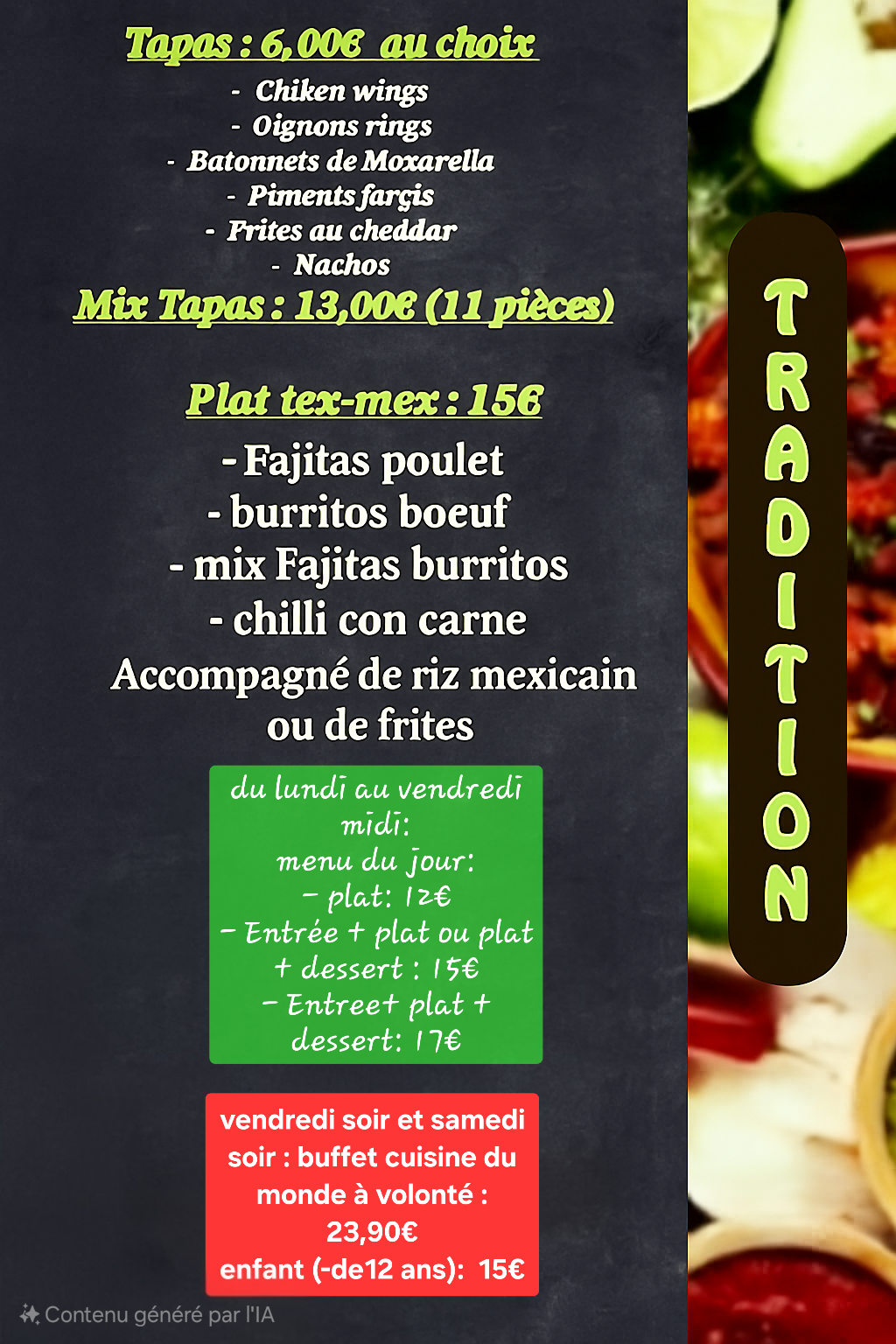 Fait maison Burger, fajitas, tapas, burritos, cocktail. Sur place ou à emporter Terrasse ombragé Réservation en ligne Menu enfant, choix végétarie, Brunch
