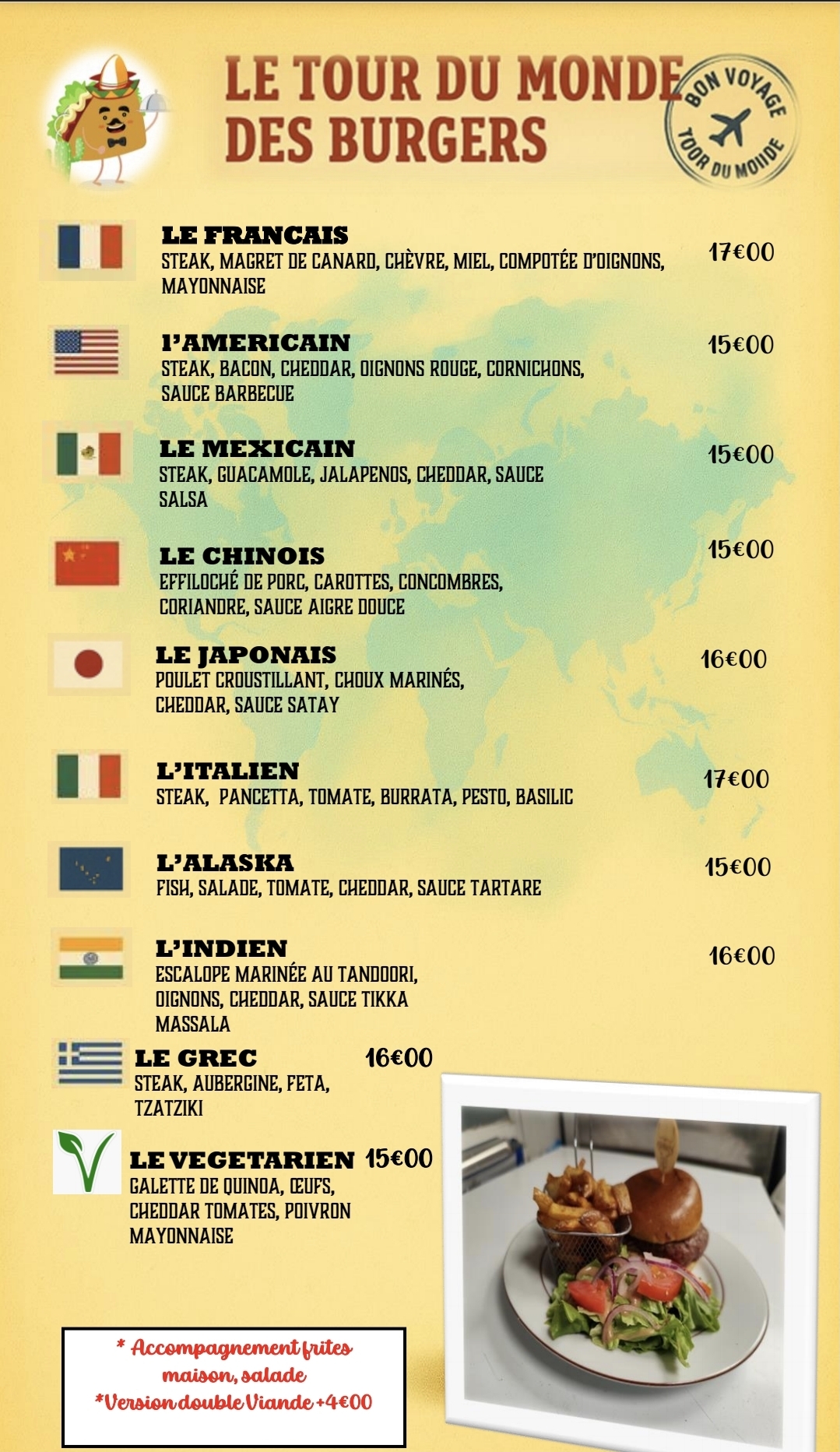 Le vendredi soir et le samedi soir nous proposons un buffet à volonté avec une cuisine du monde maison, diverses plats américains, mexicain mais aussi africain , asiatique et européens vous serons proposez en libre service.